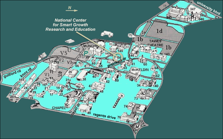 Click on the Preinkert Field House link in the left-hand column to zoom into the location of the National Center for Smart Growth Research and Education.