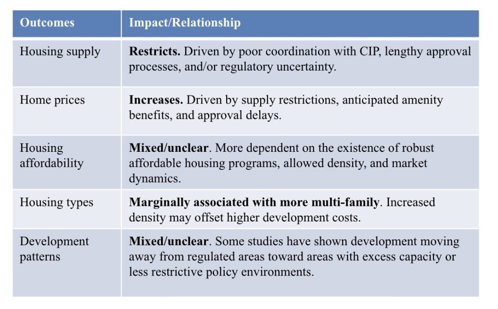 Research shows that APFOs have mixed relationships with housing outcomes. When poorly coordinated with capital improvement plans, APFOs can restrict housing supply: in the Baltimore-Washington suburbs, falling housing starts and building moratoria were attributed to APFOs. However, studies in California found neutral or positive relationships with housing production.